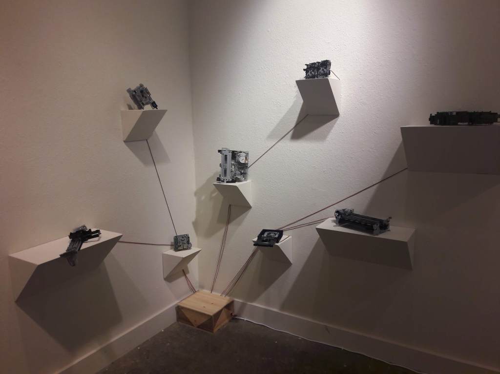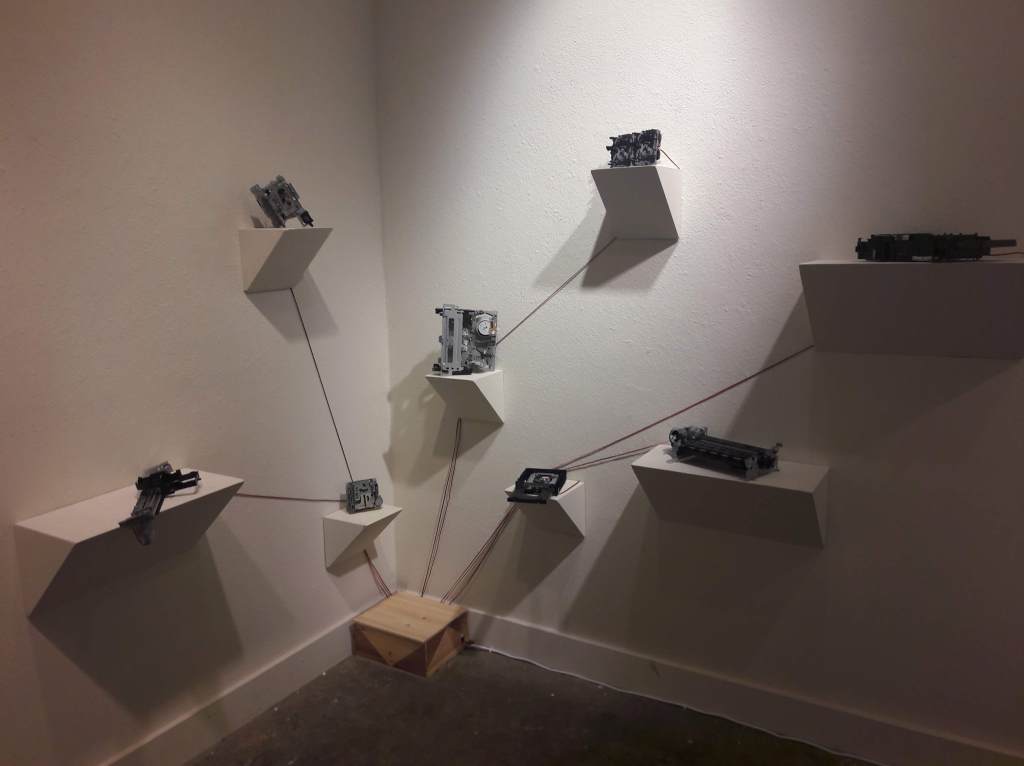 Influencé par Rainforest, l’une des principales installations du compositeur David Tudor, Dynamis crée un écosystème unique. En réutilisant de vieux moteurs provenant d’équipements obsolètes tels que des lecteurs DVD, des imprimantes, des cassettes ou des magnétoscopes, et en orchestrant leurs mouvements dans un espace pour générer des compositions musicales, elle suscite des discussions sur l’écologie sonore.
