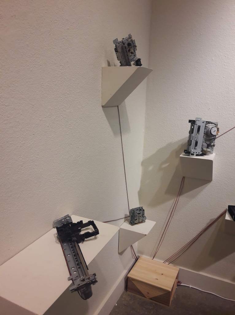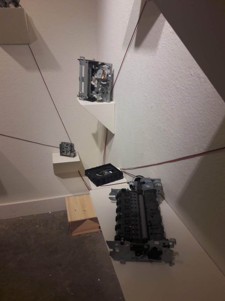 Influenced by Rainforest, one of the major installation by the composer David Tudor, Dynamis creates a unique ecosystem. By repurposing old motors sourced from obsolete equipment such as DVD players, printers, cassette or VHS players, and orchestrating their movements within a space to generate musical compositions, it prompts discussions about Sonic Ecology.