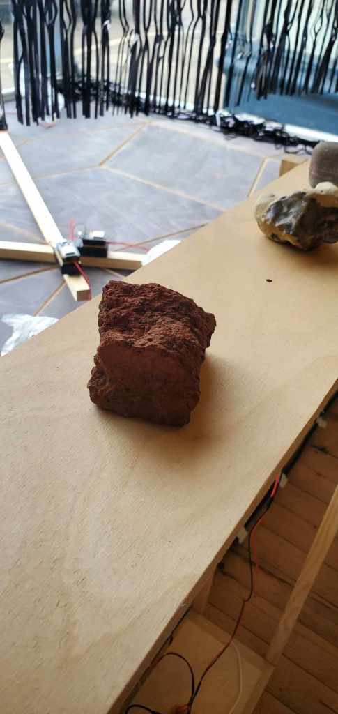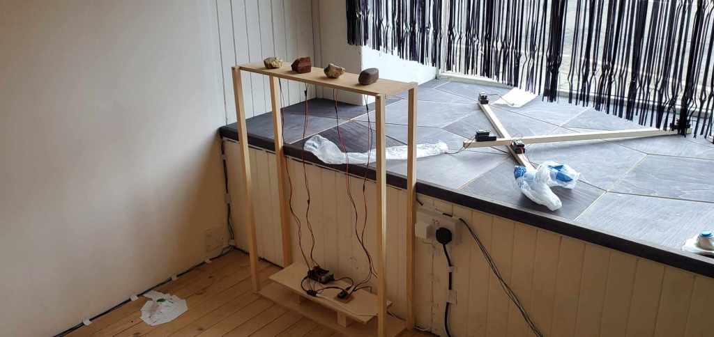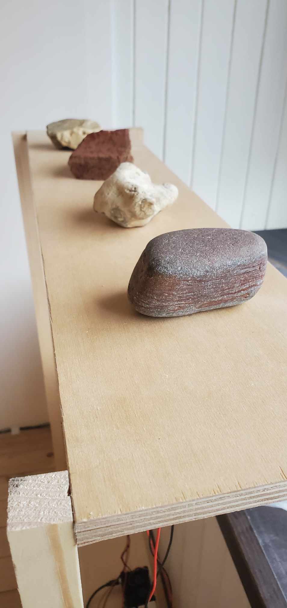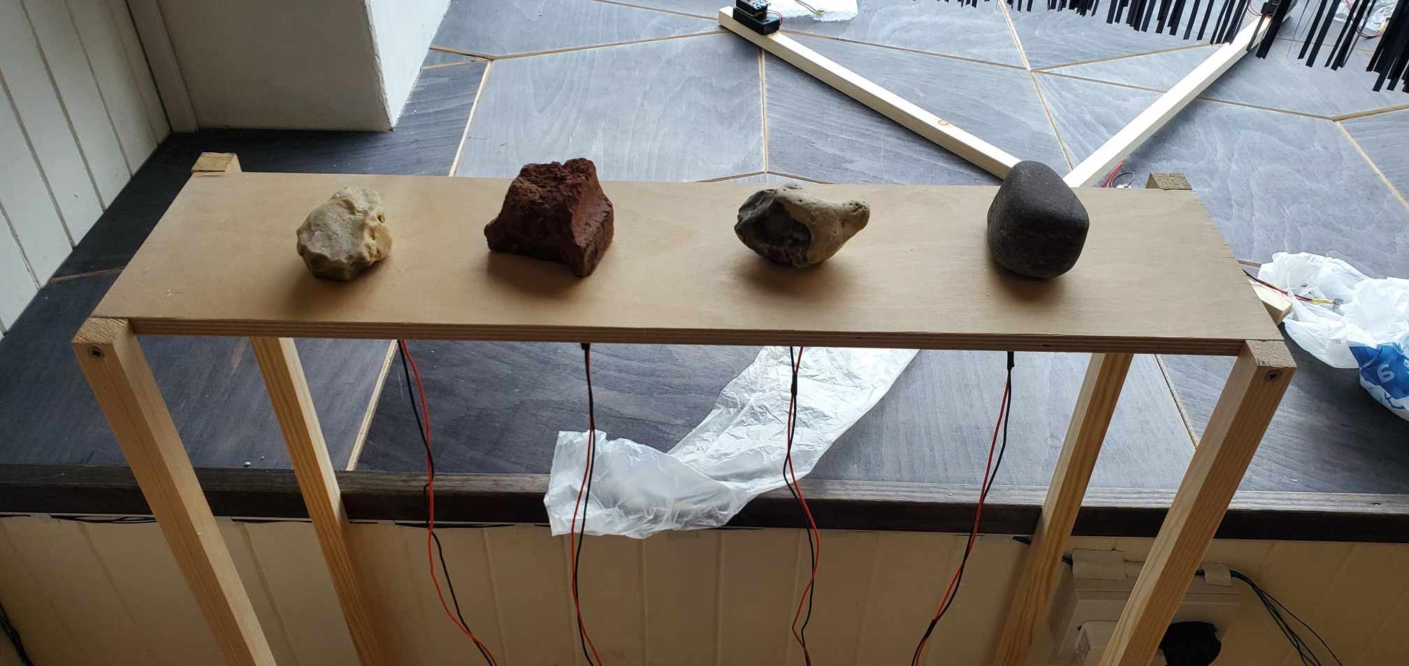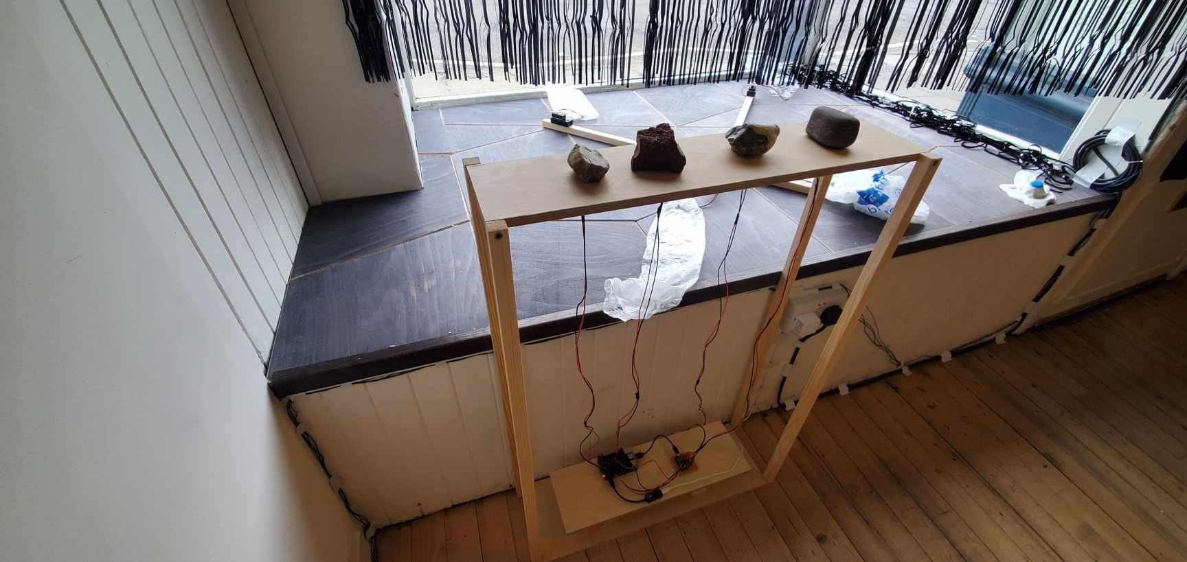 At the heart of this interactive sound installation lies the gentle quivering of plastic and paper bags and wrapping papers. Engaging with the exhibit, visitors are invited to manipulate rocks on a shelf, triggering the random trembling and gentle rustling of various types of bags. These motions and sounds are brought to life by small vibrating motors, akin to the ones found in our ubiquitous mobile phones, their movements precisely controlled by electronic modules discreetly attached to the walls of the space.