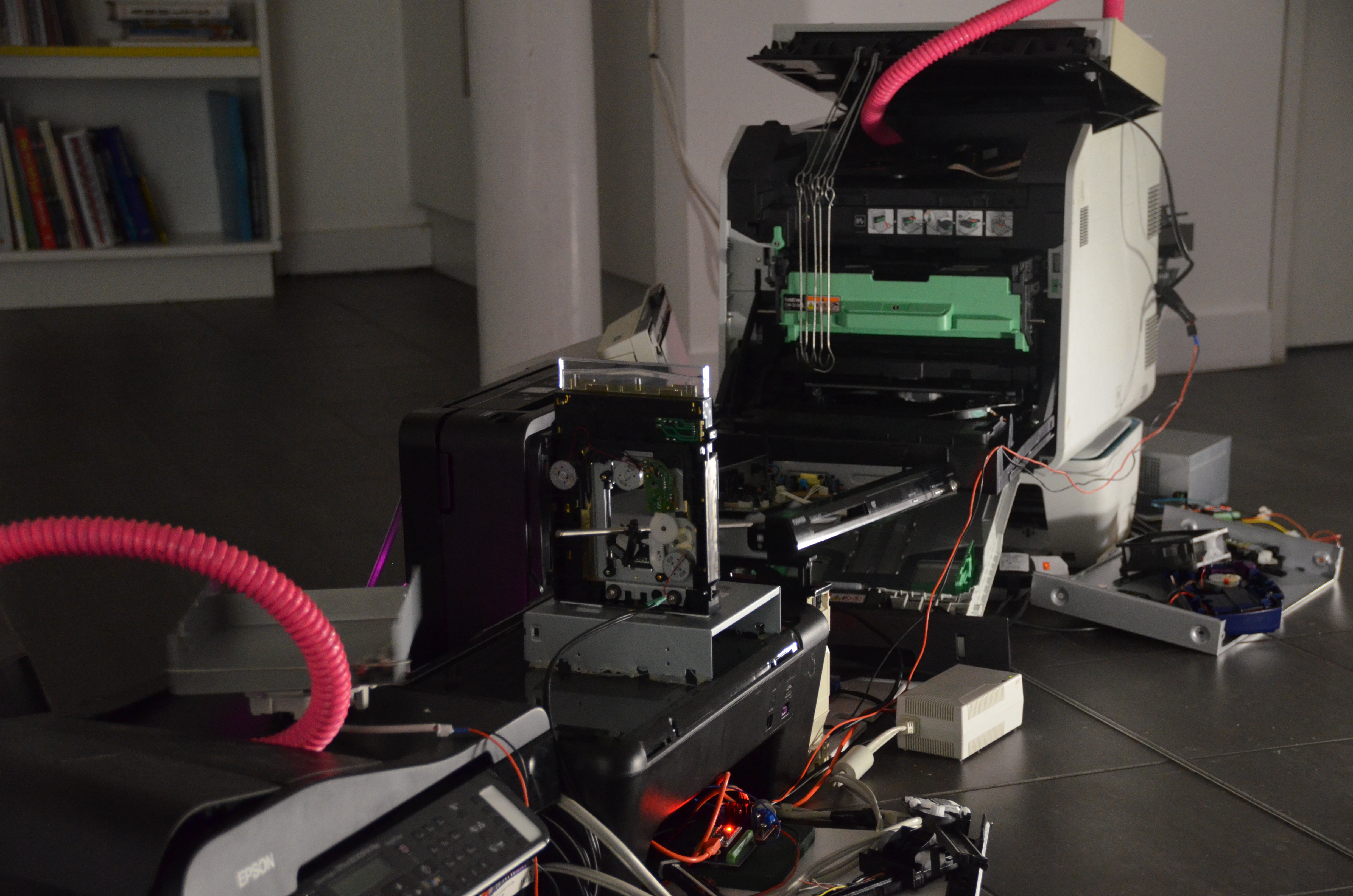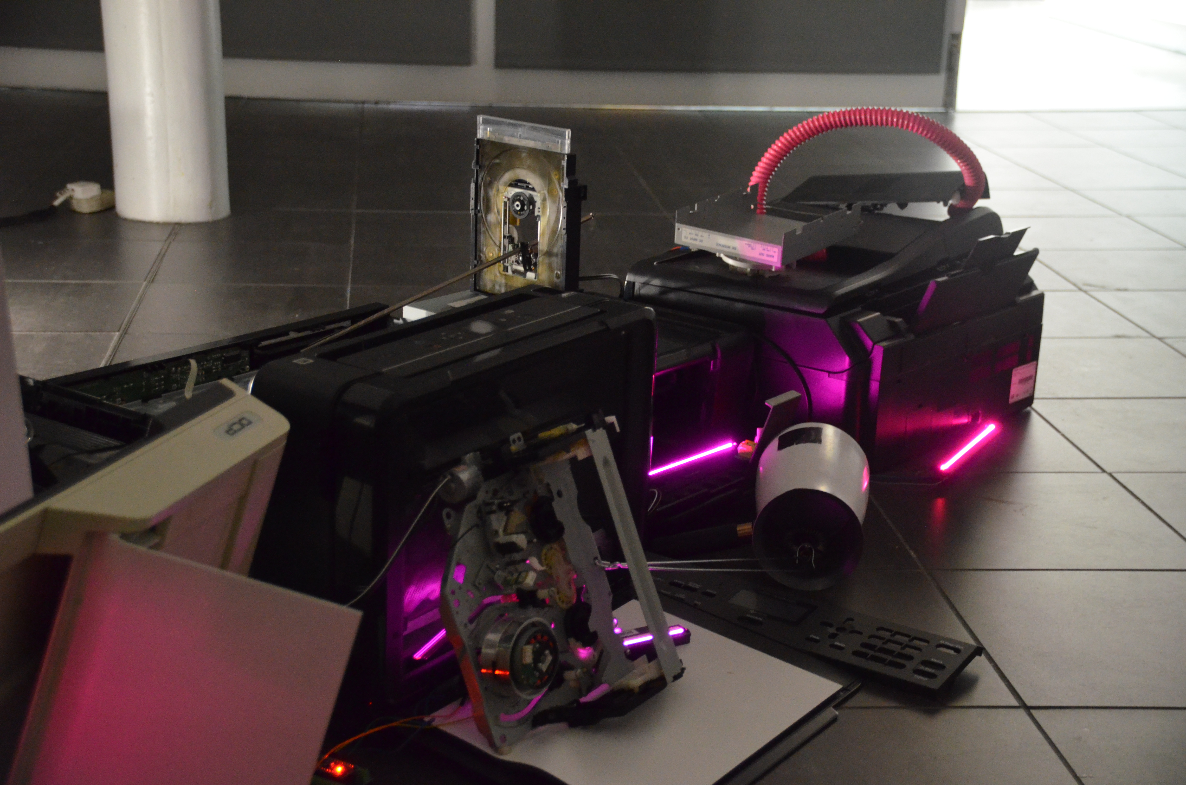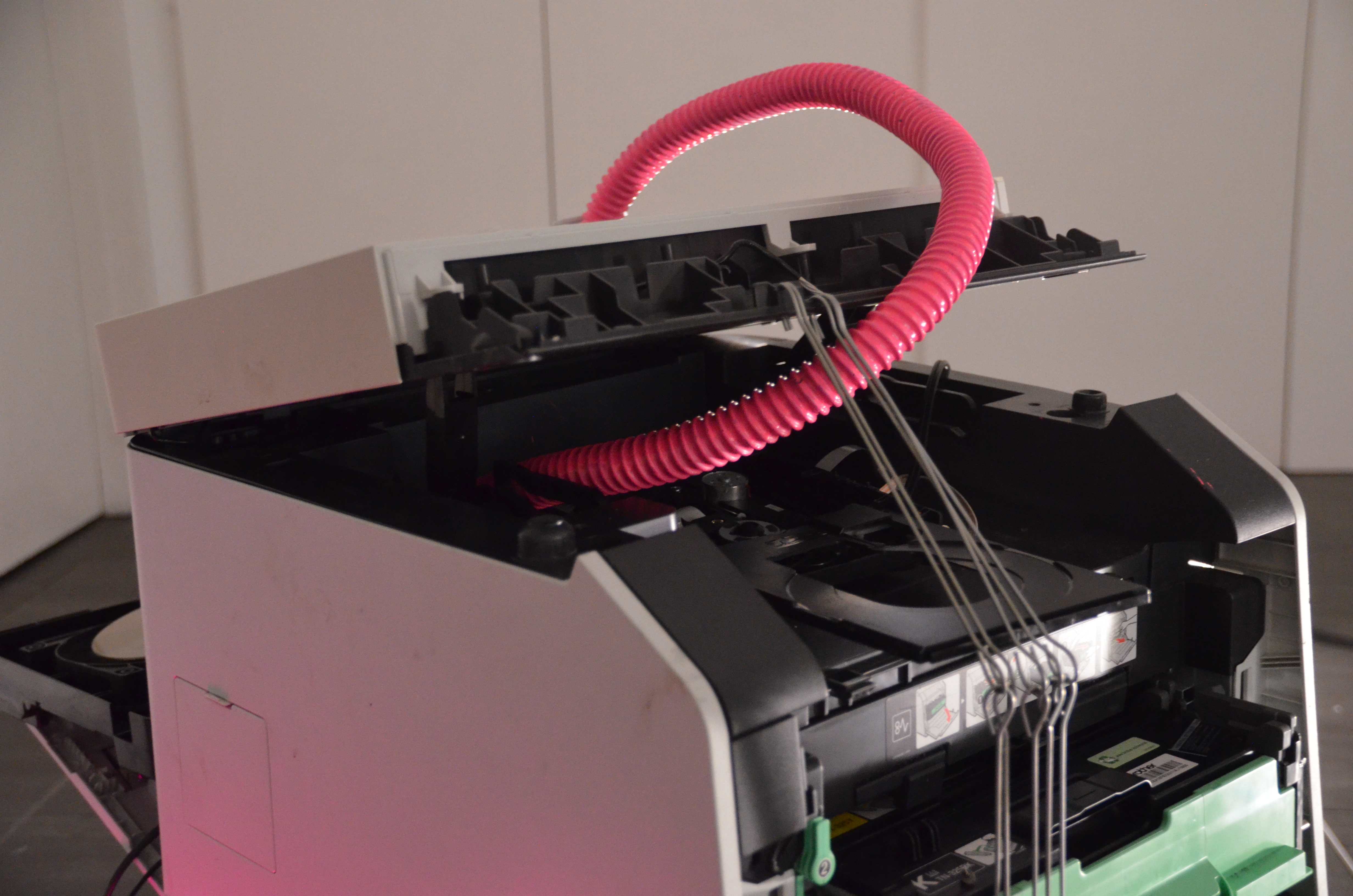 Boris Allenou dismantles and hacks household electronics such as discarded personal printers and DVD players to (re)connect technical objects to himself; reacquainting them in new forms. This installation is a culmination of the artist’s residency at Aspex Portsmouth and is a (re)appropriation exercise. Printing Myself / Gradual Conversion questions the social role of ‘conversion’, re-imagining how technological instruments could be used, ultimately exploring their ephemeral lifespan and our relationship with technology.