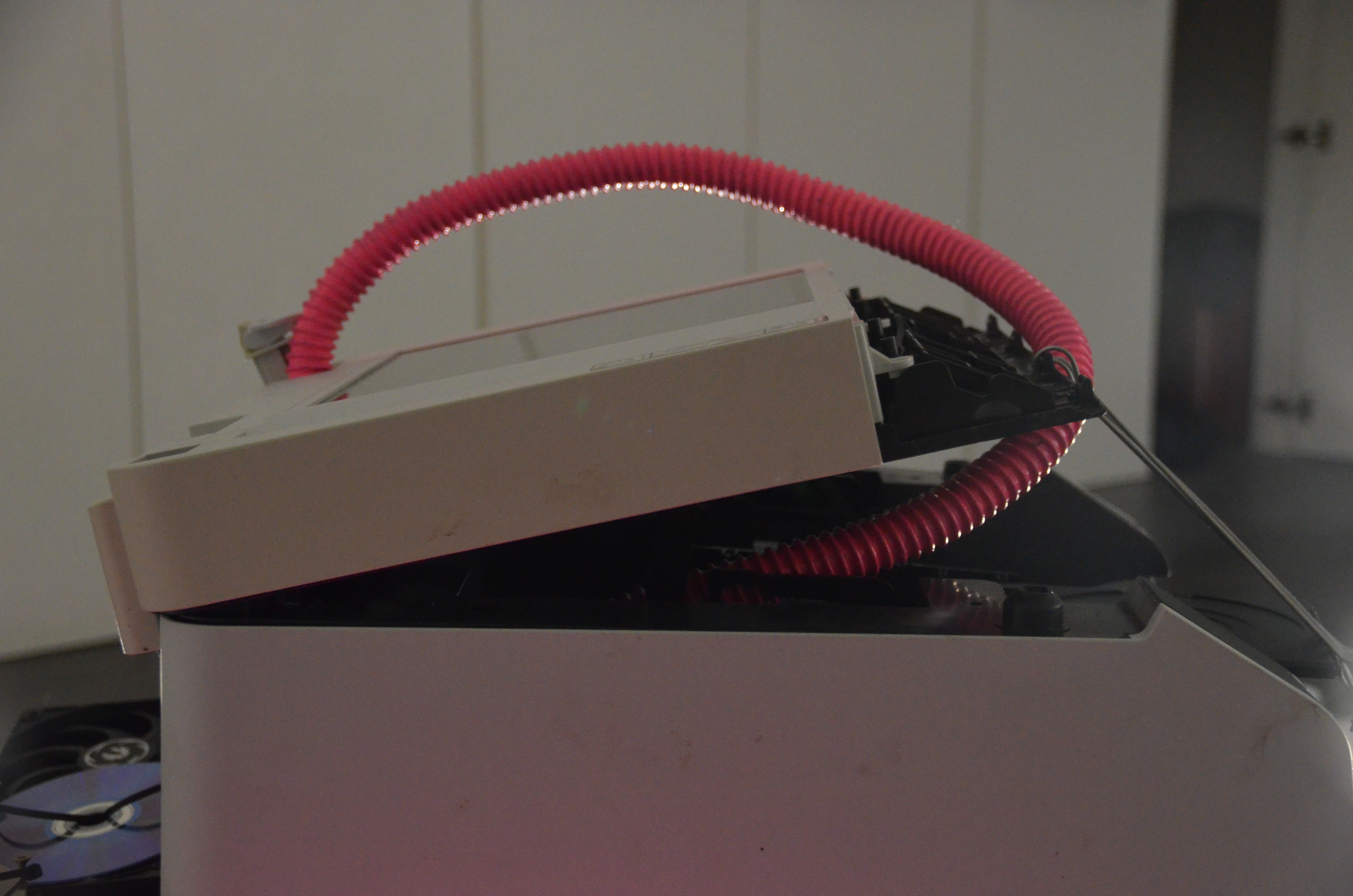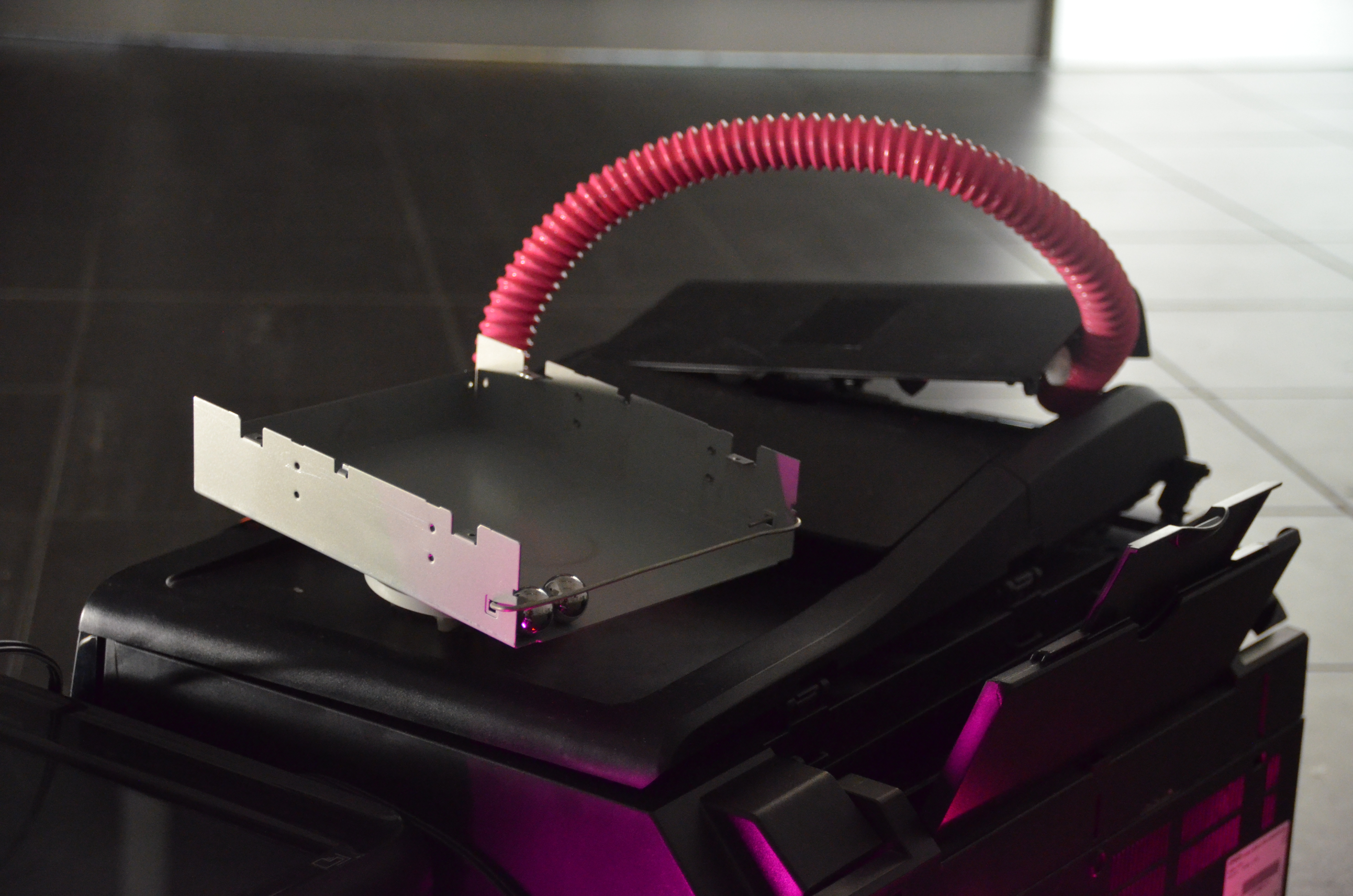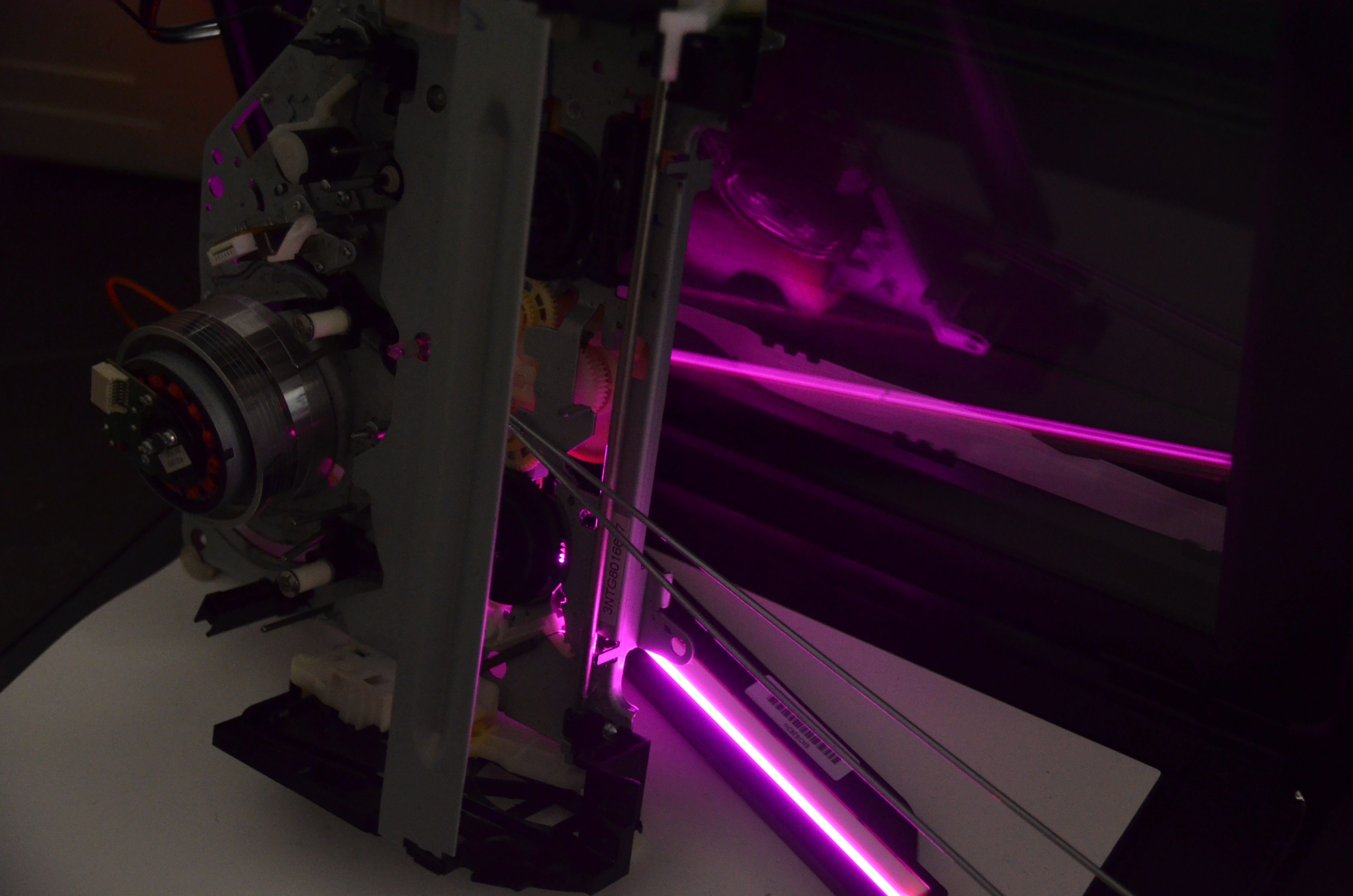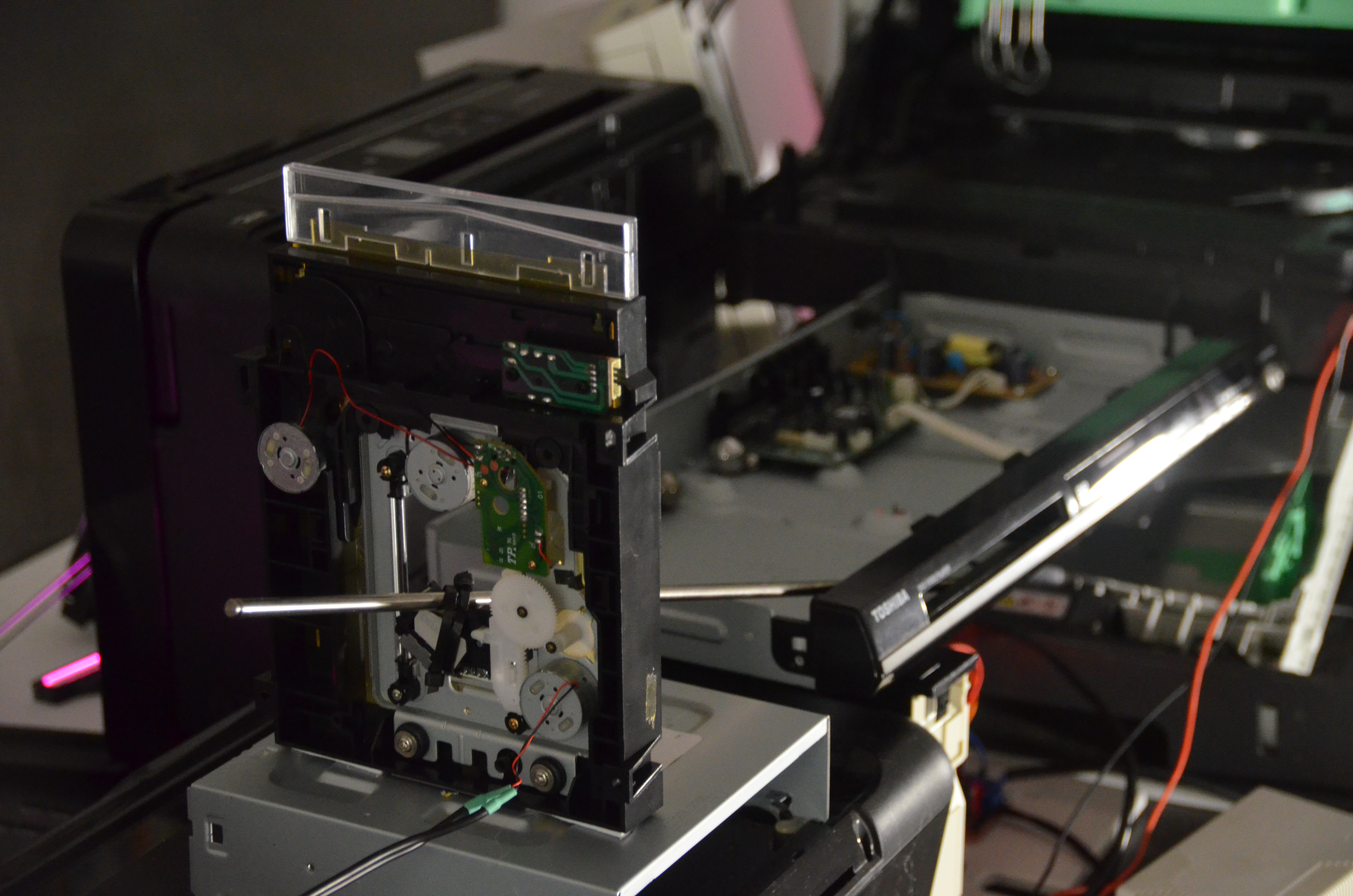 Boris Allenou dismantles and hacks household electronics such as discarded personal printers and DVD players to (re)connect technical objects to himself; reacquainting them in new forms. This installation is a culmination of the artist’s residency at Aspex Portsmouth and is a (re)appropriation exercise. Printing Myself / Gradual Conversion questions the social role of ‘conversion’, re-imagining how technological instruments could be used, ultimately exploring their ephemeral lifespan and our relationship with technology.