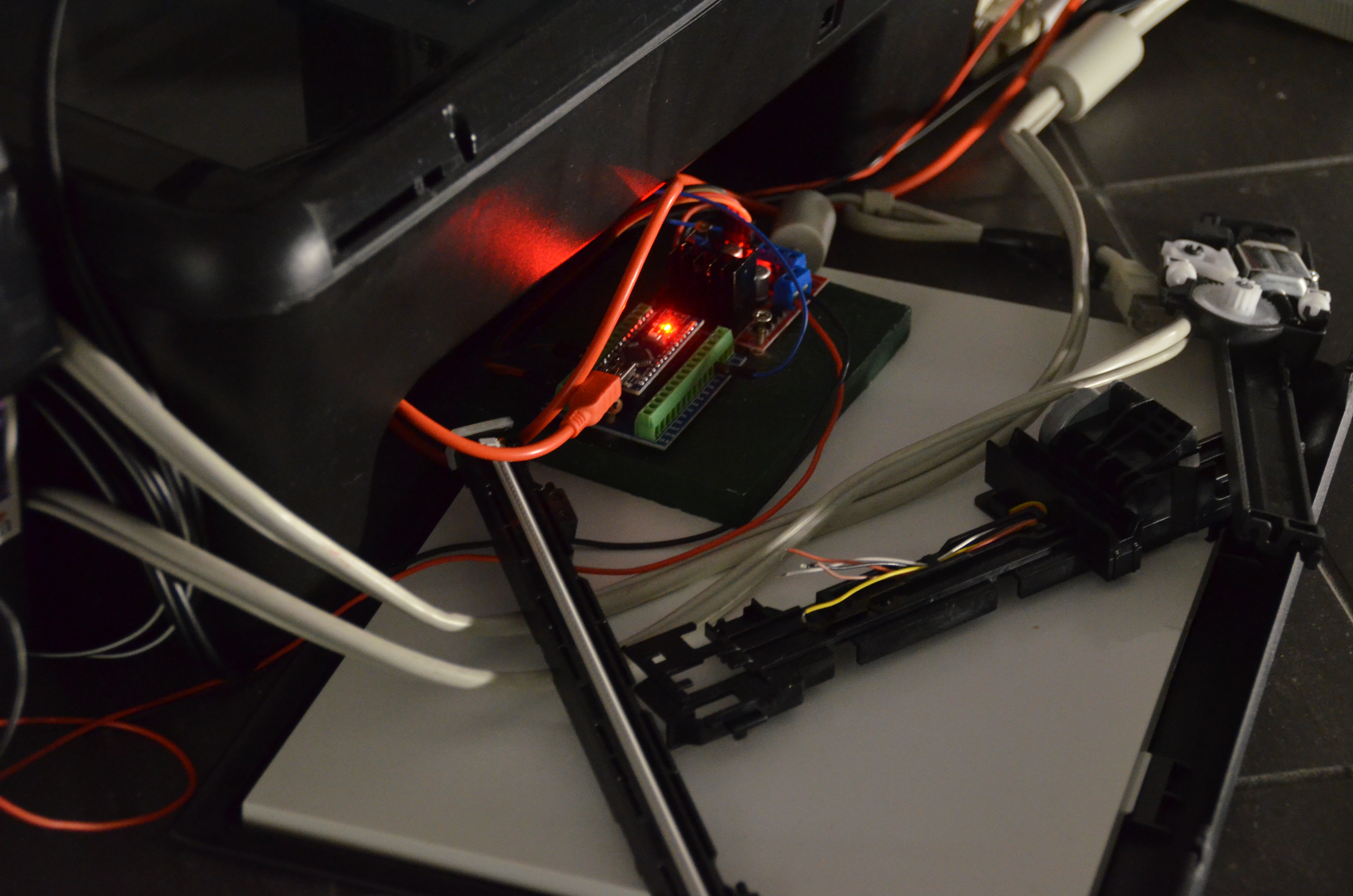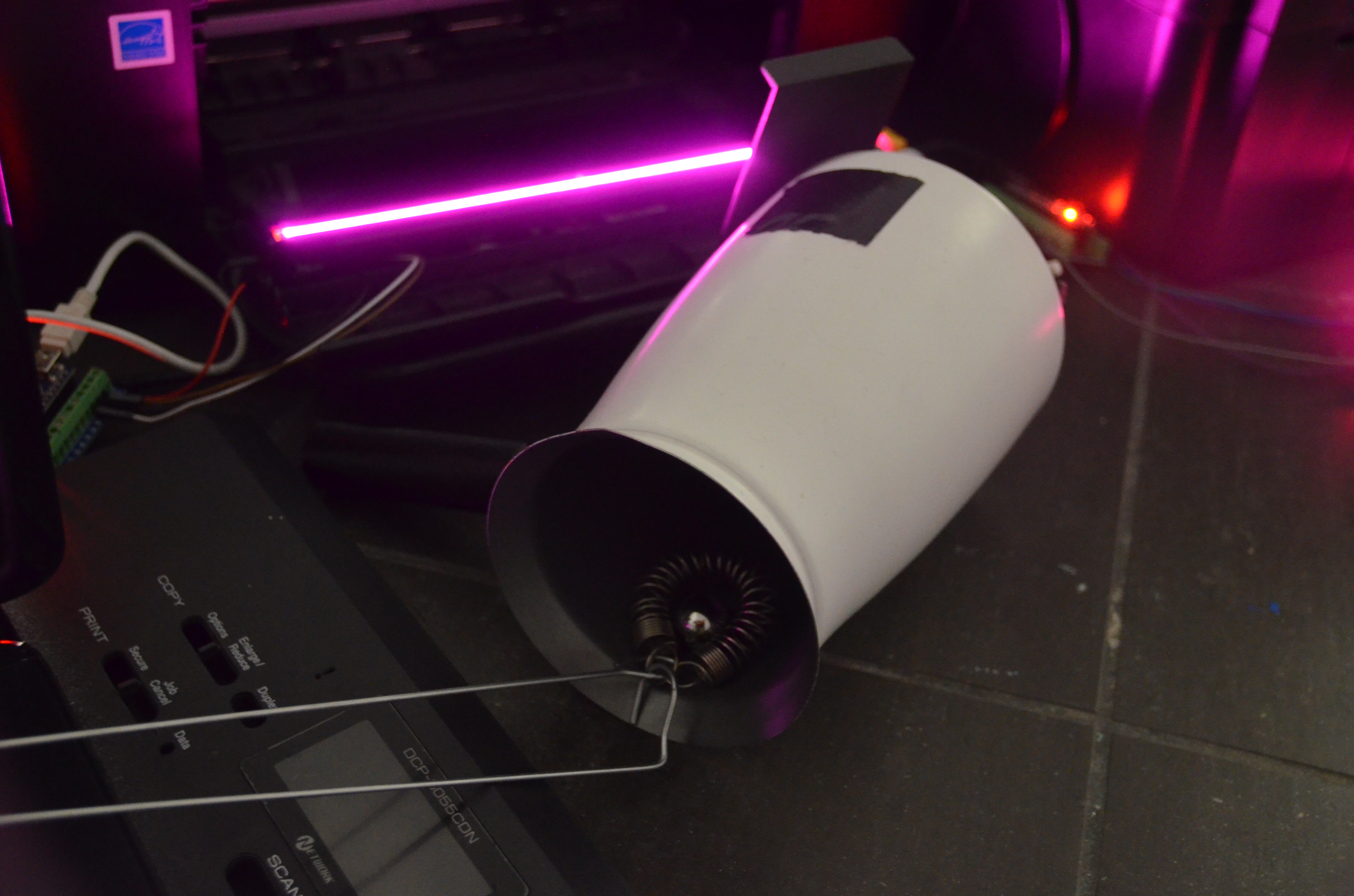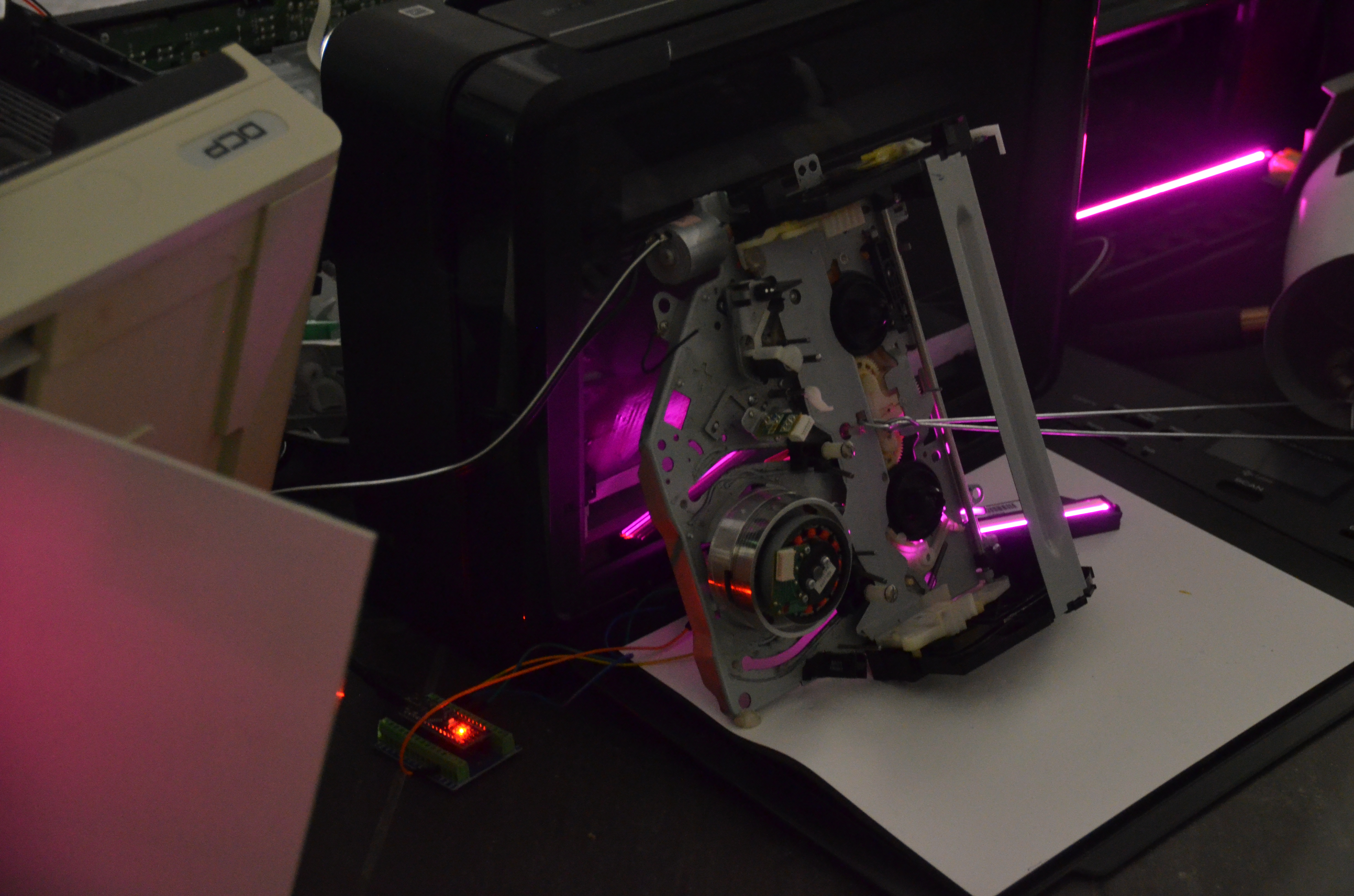 Discarded printers, DVD players, and coffee machines, computer fans, Motors, Micro-controllers, Cables, Scanner lights, Plastique pipes, Metallic marbles, CD